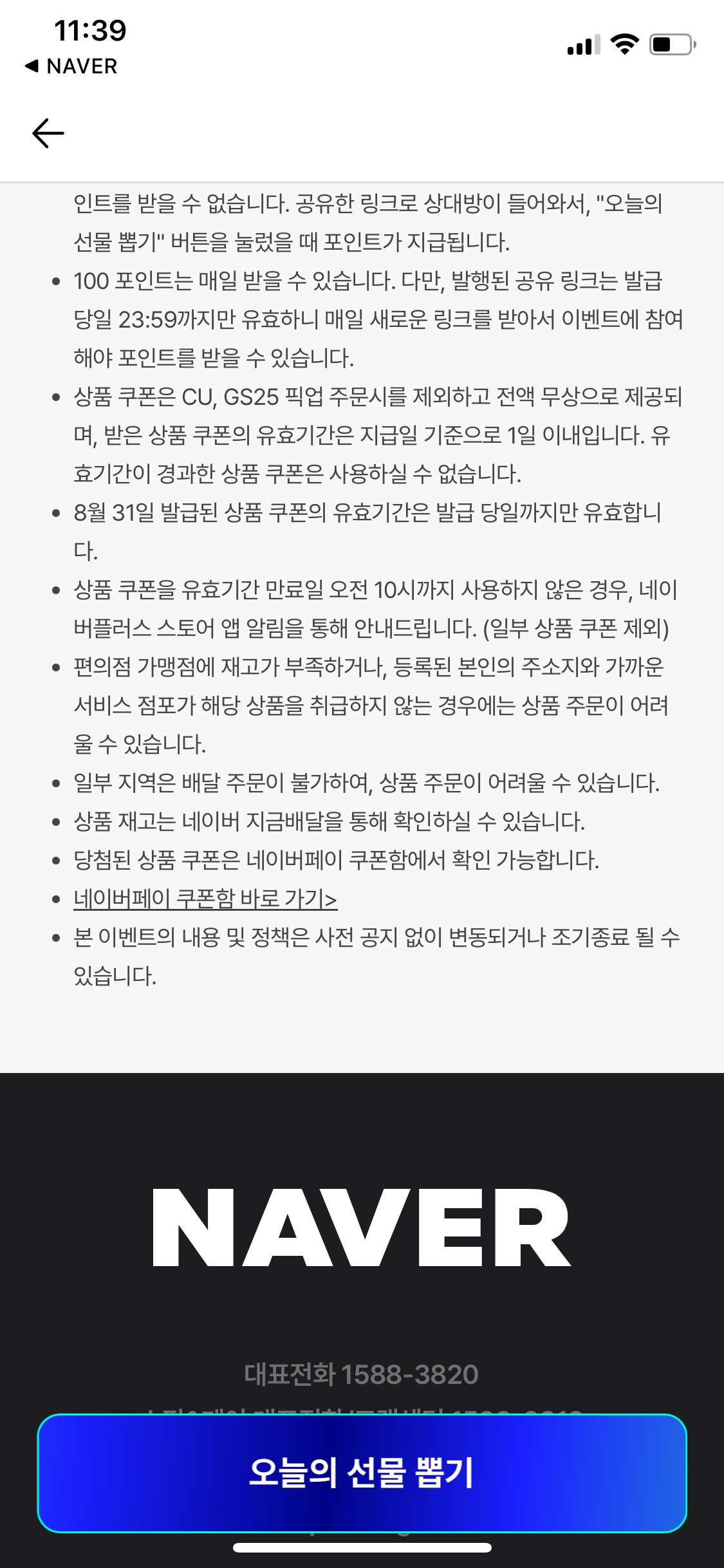 지난달에도 네이버에서 지금배달 상품뽑기를 진행했었는데 이번에 또 하고 있더라구요, 지난번에 3일연속 뽑기를 해서 최소주문금액만큼 다른 상품 골라 담고 함께 배달 주문 했었어요. 지난달에는 뽑을때마다 잘 당첨이 되었는데 이번에는 꽝도 나오긴하더라구요 ㅠㅠ 원래는 배달만 되었던거 같은데 이번에는 일부 쿠폰은 100원 결제하면 픽업주문도 가능하네요. 지난번에 비해 많이 박해졌네요. 유효기간도 짧아졌구요.
