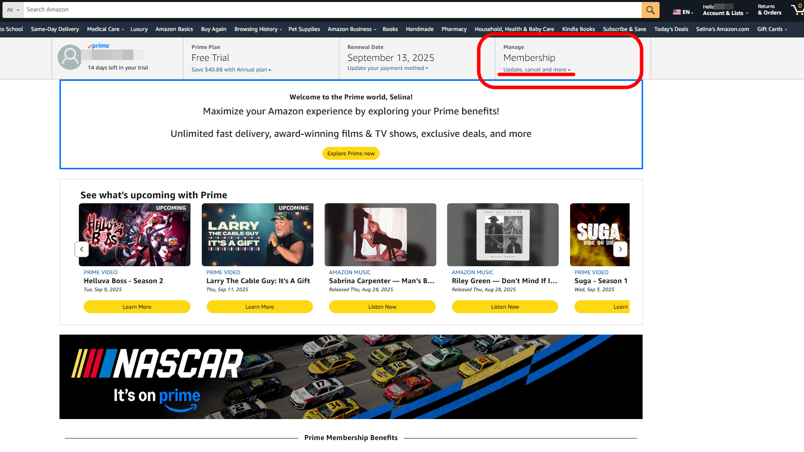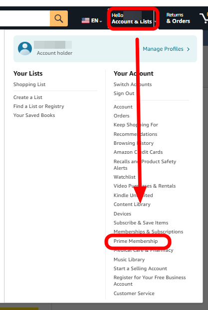 먼저 미국 아마존 로그인을 해줍니다. 로그인 후 우측 상단을 보면 Hello~ 라고 되어있어요, 이부분을 클릭해서 프라임 멤버십을 클릭해주세요. 그럼 멤버십 가입이 뜹니다. 필자는 무료기간이라서 프리 트라이얼이라고 뜨네요. 아직 14일의 무료 기간이 남았는데 해지하더라도 2주 동안은 프라임 혜택을 볼 수 있습니다.