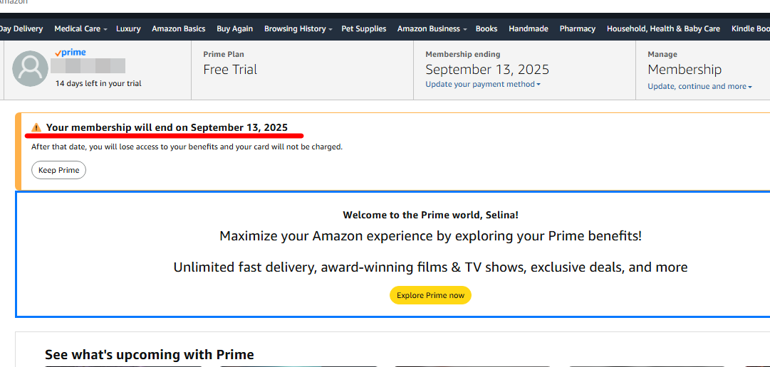그럼 멤버십이 종료되는 날짜가 뜨네요. 해지는 되었고 남은기간 동안 프라임 혜택을 보면서 아마존을 이용하면 되겠습니다.