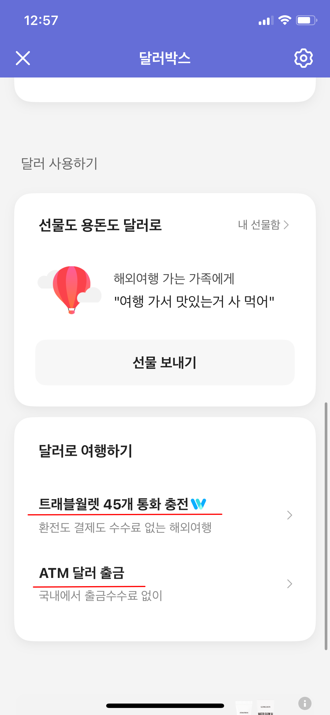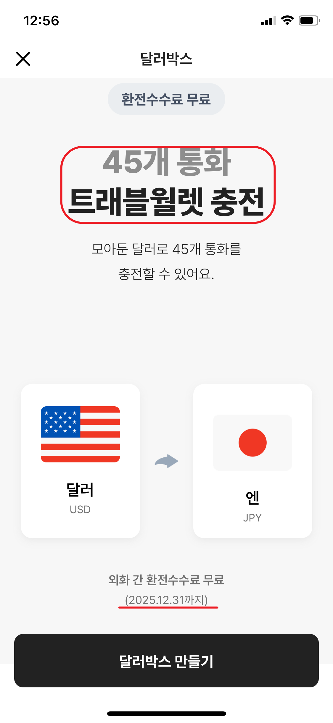 달러박스로 모은 달러로 트래블월렛 충전 가능하고, 이때 45개 통화로 충전 할 수도 있어요. 외화간 환전수수료도 무료(올해까지만)니 달러박스를 안 만들 이유가 없겠더라구요. 하루에 5천달러, 한달 5만달러까지 넣을 수 있고, 달러 출금은 하루 1만달러까지 가능네요!