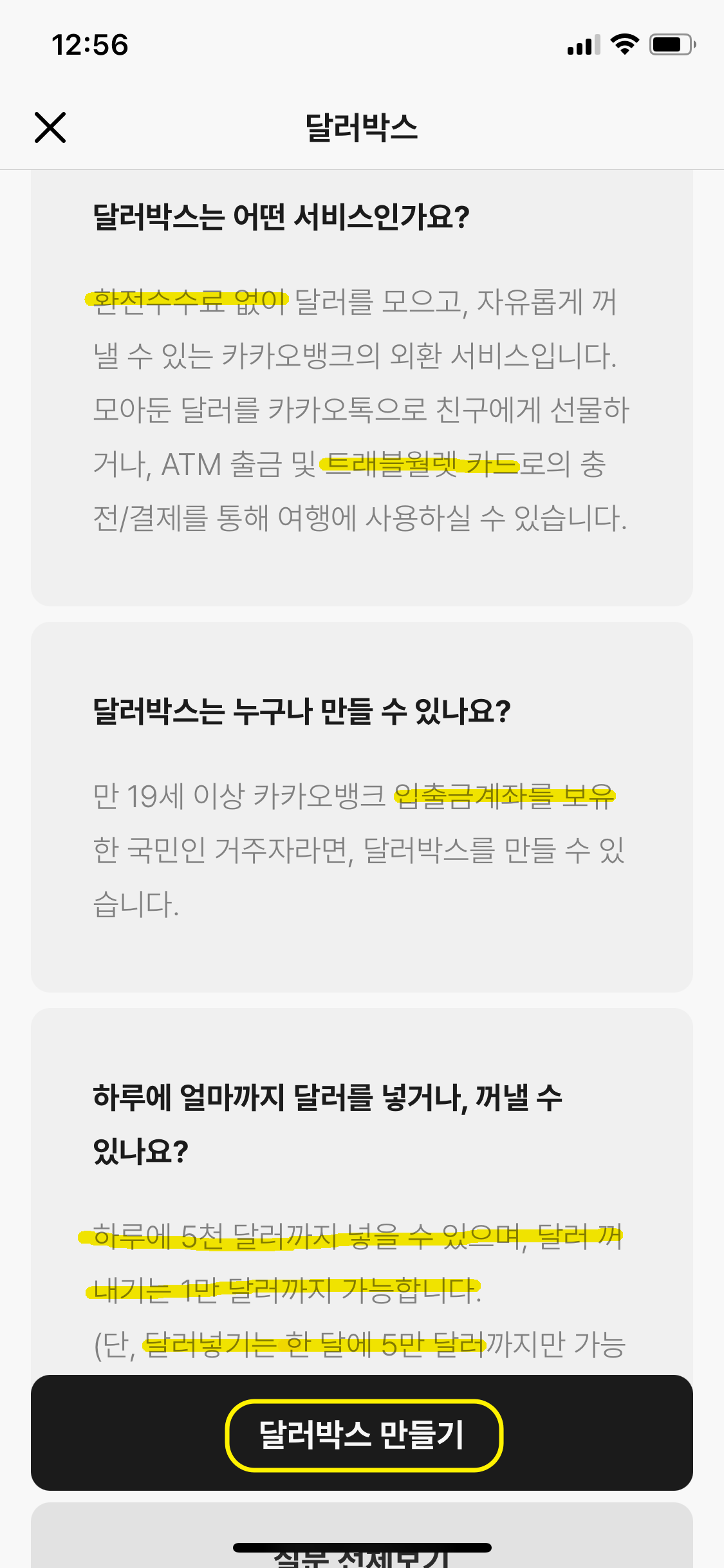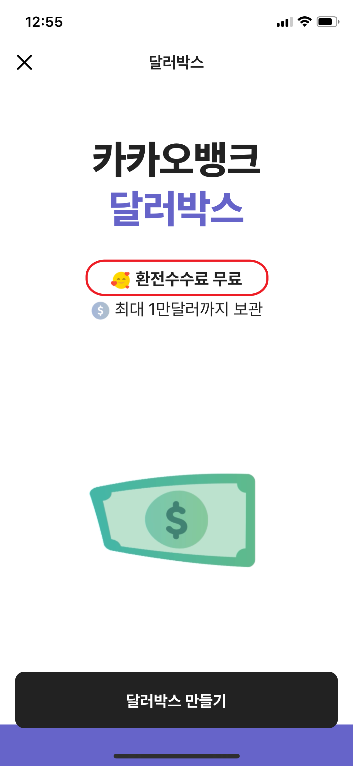 카카오뱅크나 토스뱅크를 많이 이용하시더라구요, 둘다 환전 수수료가 무료입니다. 환테크용이기 때문에 계속 샀다 팔았다 할거니 환전수수료가 없는 부분이 맘에 들었습니다. 토뱅보다는 카뱅을 자주 이용하기 때문에 카뱅에서 달러박스를 개설했습니다.