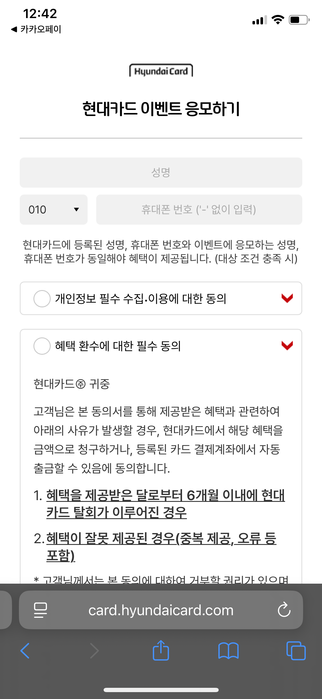 그래서 이벤트 응모하기를 먼저하시는걸 추천합니다. 카카오페이 현대카드의 경우 이벤트 응모하기 하면 확인 문자가 옵니다. 그런데 다른 카드사의 경우에는 안오더라구요. 응모가 잘되었나 확인하려면 다시 이벤트 응모하기를 눌러서 해보시면 됩니다. 되었다면 이미 응모했다고 뜹니다. 한번 더 확인하는게 아무래도 좋겠죠?
