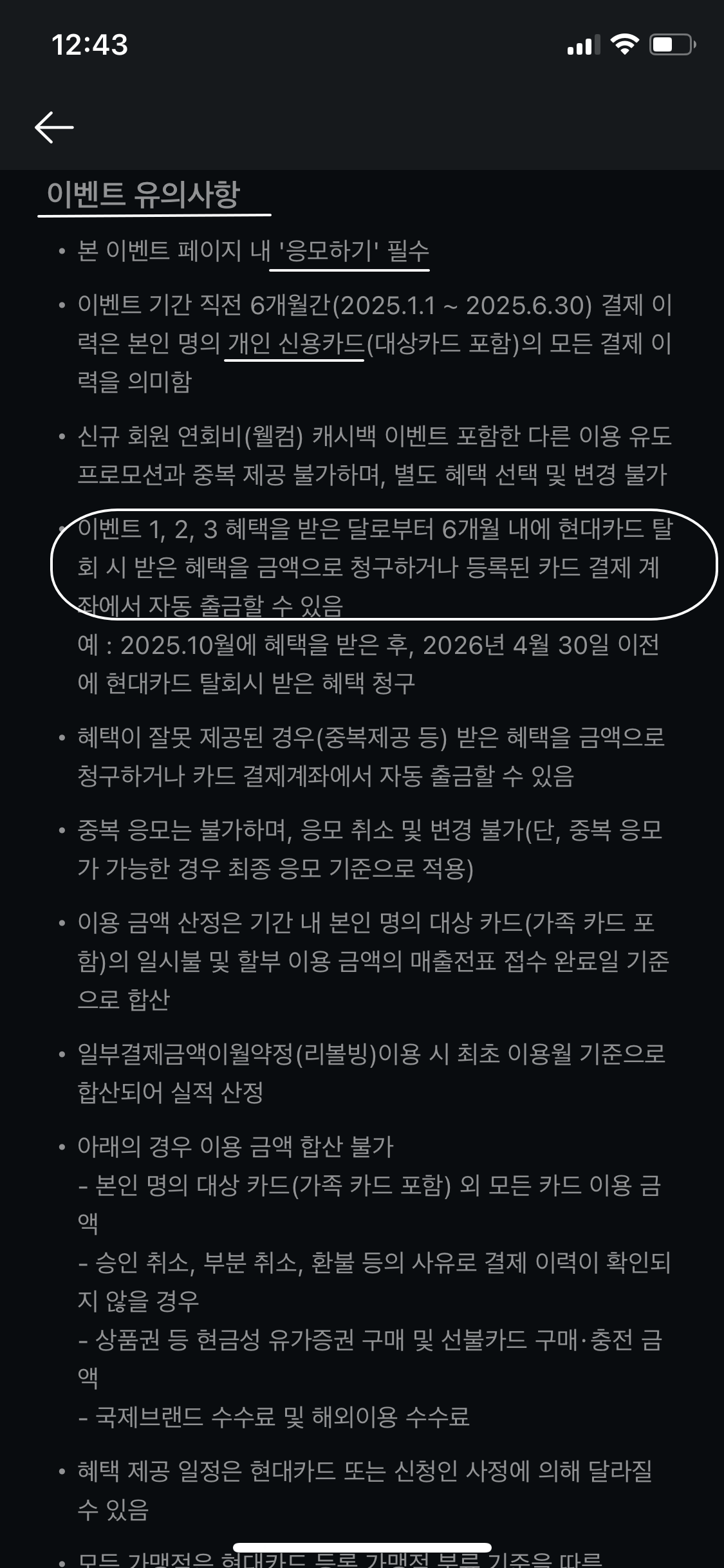 이벤트 제외대상도 한번 읽어보겠습니다. 12개월이내 현대카드사 프로모션 혜택을 제공받은 이력이 없어야 하네요. 그럼 12개월이내 현대카드 이벤트 이력이 없고, 6개월이내 현대신용카드 결제이력이 없는 경우만 이번 카카오페이 카드 이벤트 혜택이 가능하겠네요.