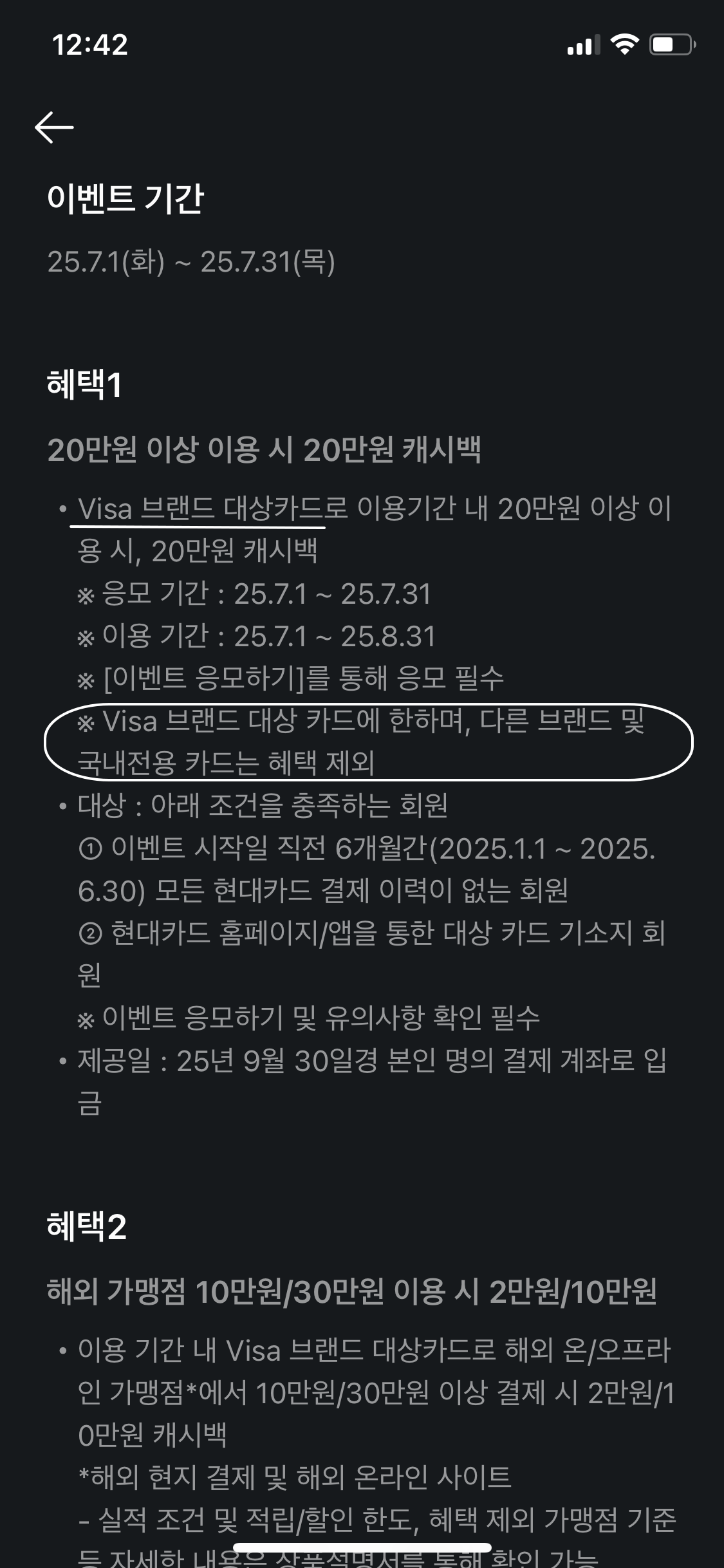 혜택 1을 보니 비자 브랜드대상입니다. 그럼 카드 발급시 반드시 비자로 발급 신청을 해야 하겠네요.