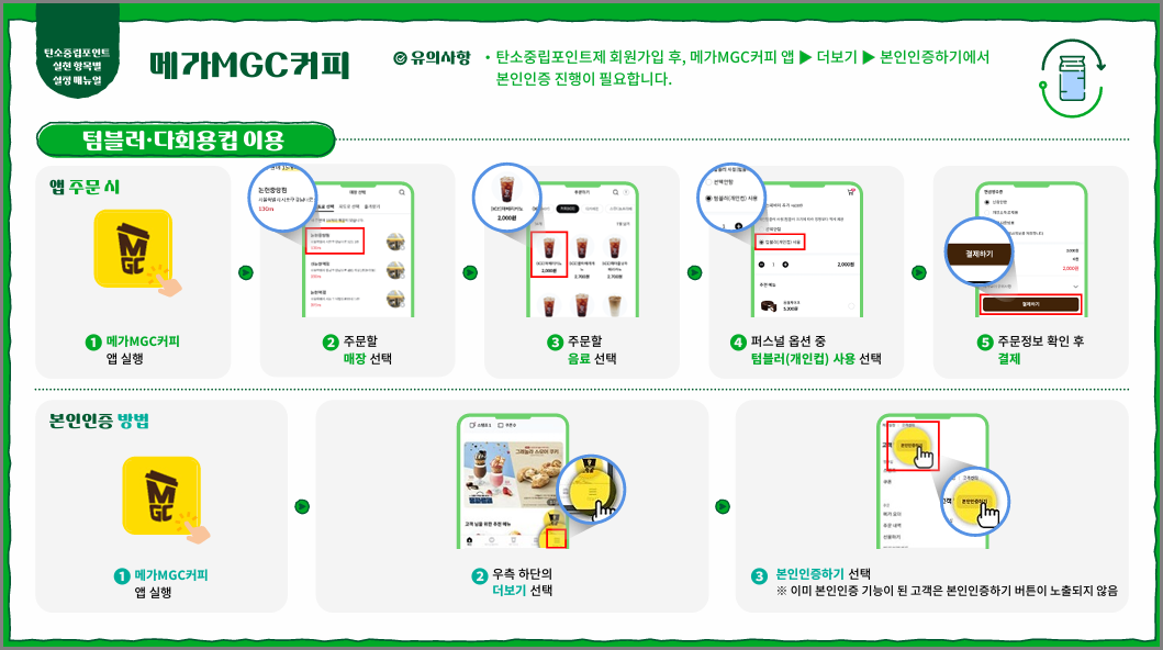 메가커피 앱을 다운받아 회원가입 후 더보기에서 본인인증하기, 매장선택, 메뉴선택 -> 개인컵선택 -> 주문결제