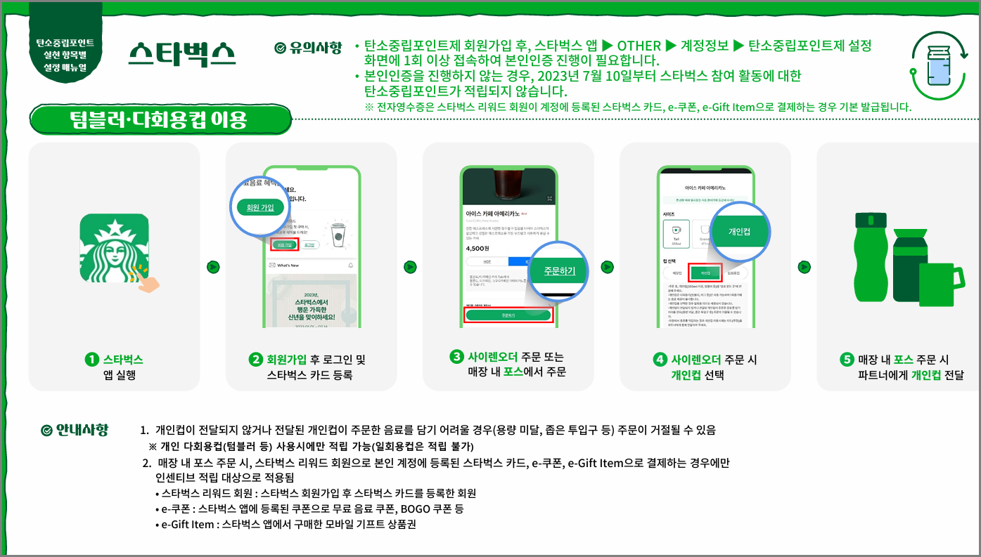 스타벅스 앱 실행(본인인증 해야함) -> 사이렌오더시 개인컵 선택(매장내 주문도 가능) -> 픽업데스크에 주문번호 알려주면서 텀블러 전달