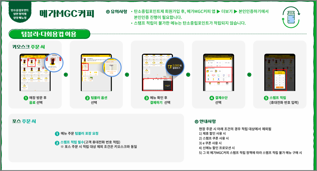 메가커피는 앱주문, 키오스크 주문 모두 적립이 가능하다고 합니다. 키오스크 주문시에는 폰번호로 적립을 받아야 탄소중립포인트 적용이 가능합니다. 더불어 스탬프 적립이 불가한 메뉴는 탄소중립포인트가 적립되지 않으니 이점 참고 바랍니다.