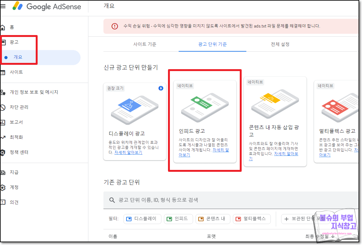 광고 -> 개요 로 들어가서 인피드 광고를 클릭해 주세요.