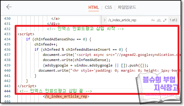 우선 코드를 만들어 보도록 하겠습니다. 아래 파일을 다운받아 열어 주세요. 1번 코드, 2번 코드가 있습니다. 인피드광고는 코드가 두개 들어갑니다.