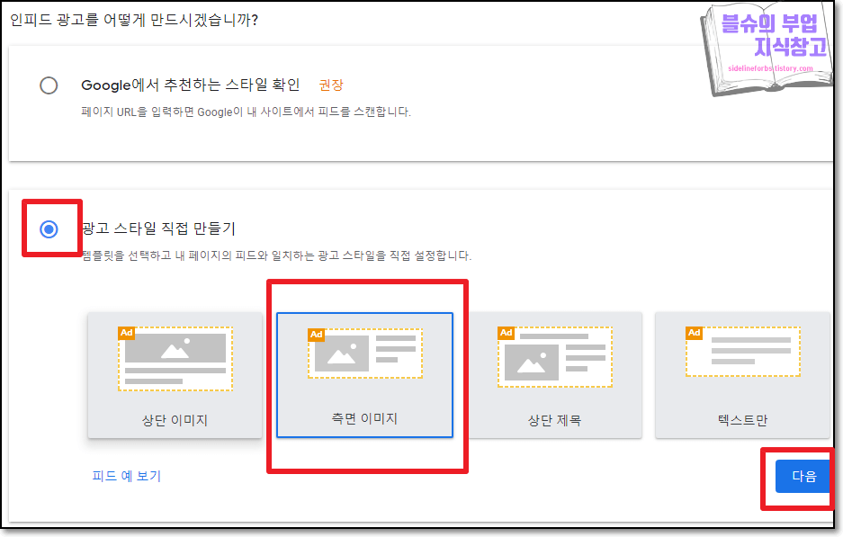 북클럽 스킨은 광고 스타일 직접만들기 -> 측면 이미지로 선택합니다.