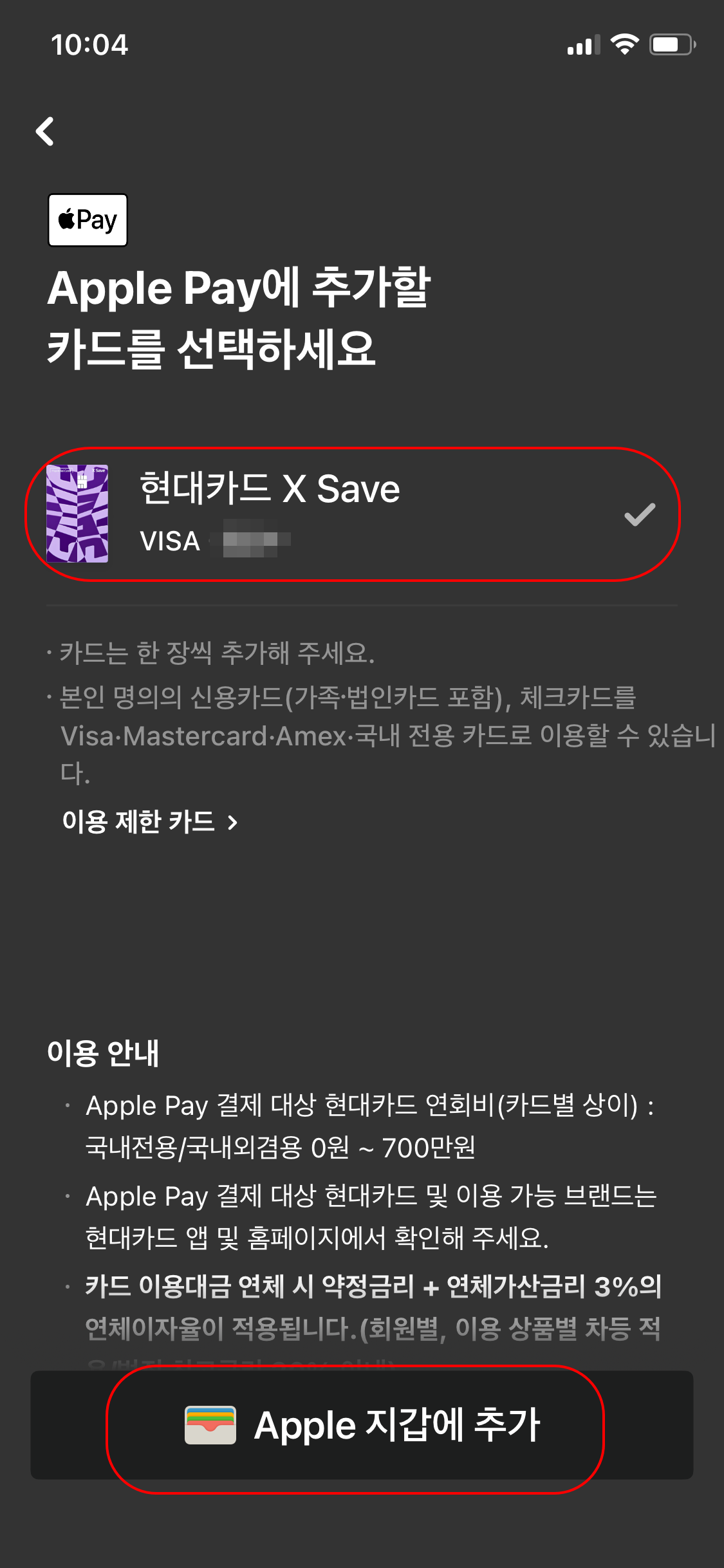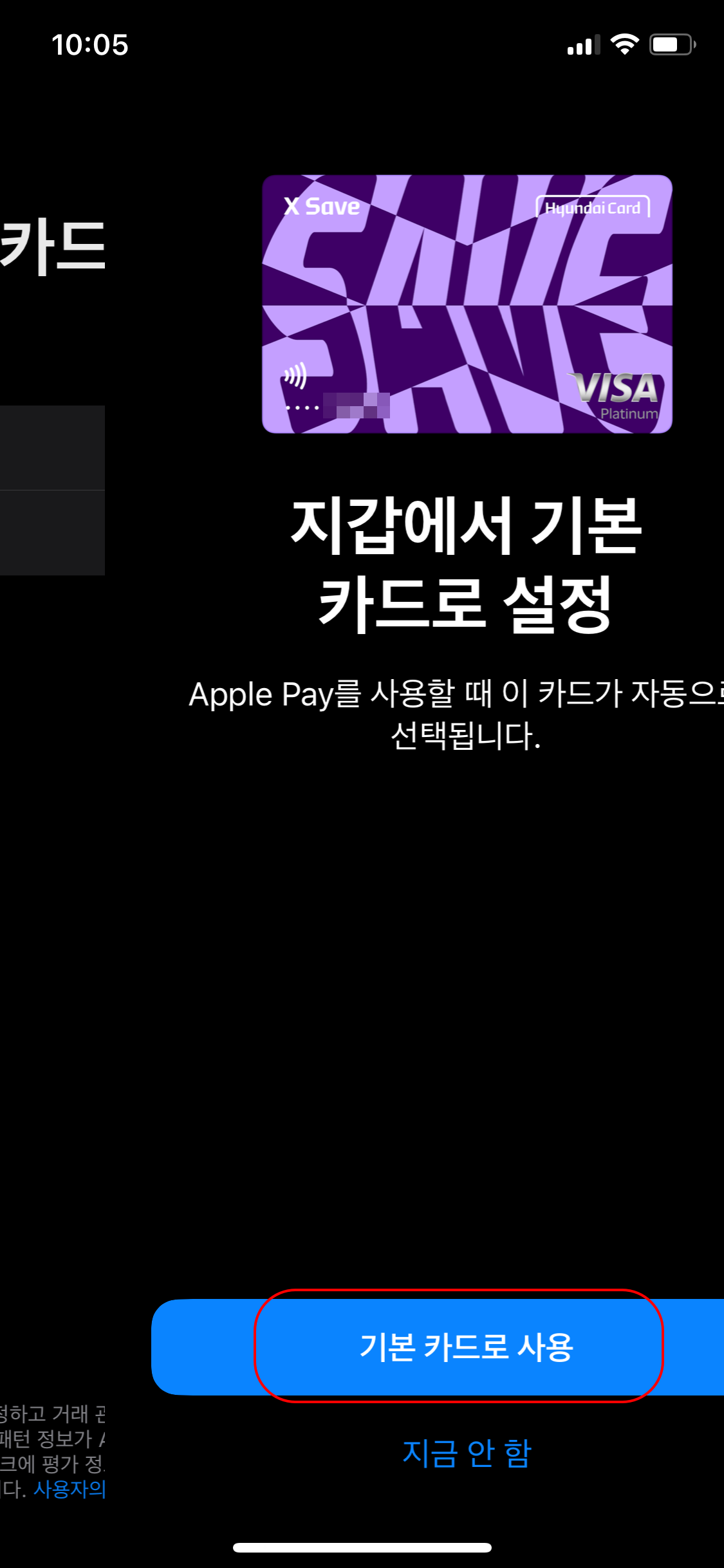 현대카드 앱을 다운받은 후 로그인을 해주세요. 로그인을 하고 상단 삼선을 클리하고 검색에 애플페이라고 치면 메뉴가 바로 나와요. 하단에 카드 추가 클릭 -> 카드 선택 후 추가 -> 기본 카드로 사용