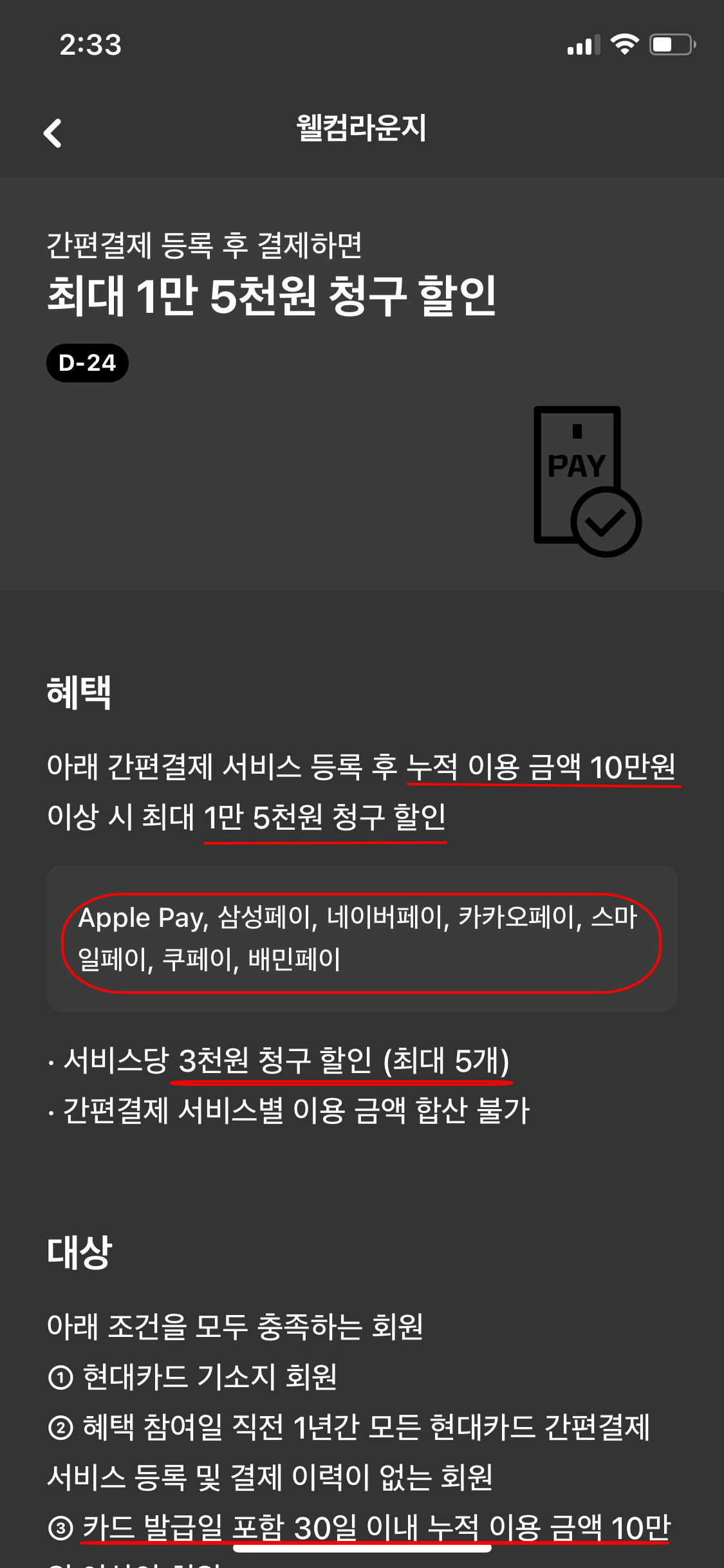 간편결제 등록은 간편결제 별 누적 10만원사용시 각 3천원 청구 할인이네요. 기재된 페이 중 사용하는 페이가 있다면 10만원씩 페이별로 끊어서 사용하셔도 좋을 것 같습니다.