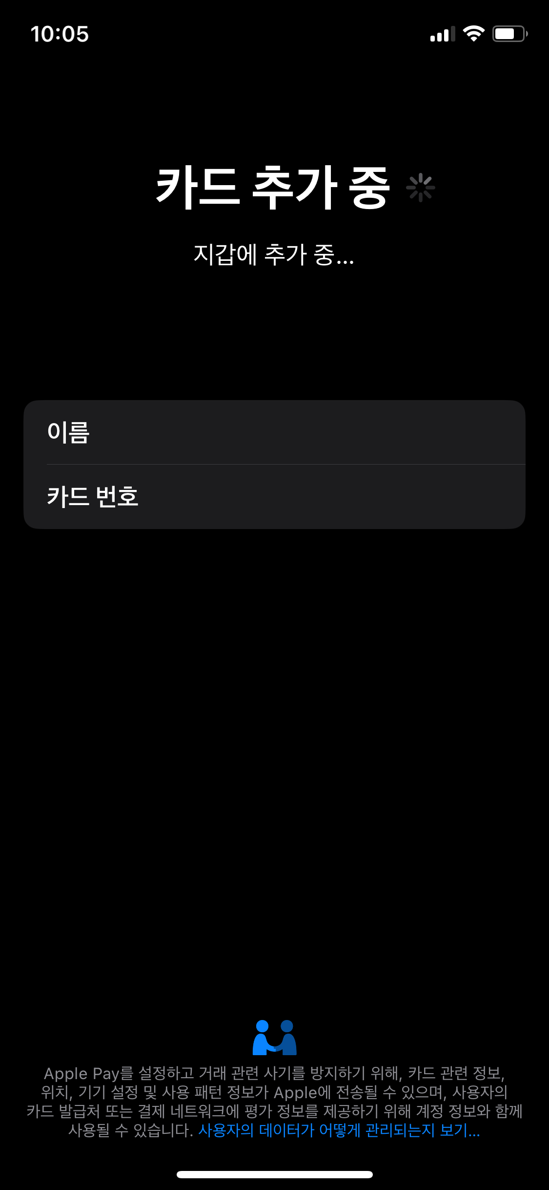 카카오페이에서 이벤트로 현대카드 발급 신청하고 (20만원사용시 20만원 캐시백), 드디어 현대카드를 받았습니다. 대리인이 수령했기 때문에 카톡으로 온 수령 등록을 해줍니다. 그러면 바로 사용이 가능한데, 필자는 아이폰을 사용하고 있으므로 애플페이에 등록해서 사용하려 합니다. 그럼 애플페이에 카드 등록을 함께 해봅니다.
