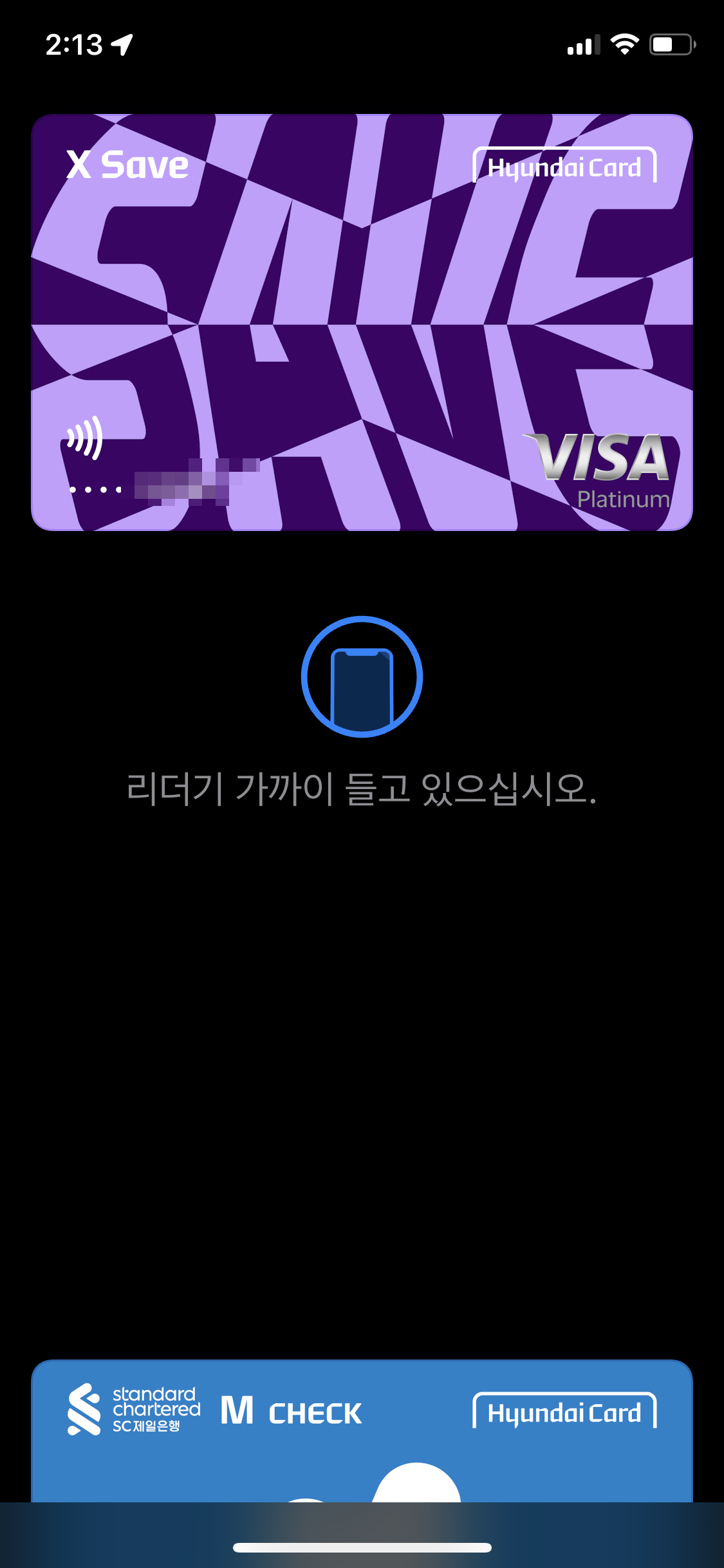 그럼 이제 애플페이를 사용해야하는데 어떻게 하는지 알아봅니다. 간단해요! 아이폰 우측 버튼을 두번 따닥 눌러주세요 그럼 카드가 바로 떠요. 화면이 잠겼을때도 되니까 결제시 바로 두번 따닥 눌러 카드 단말기 가까이 대고 결제해줍니다.